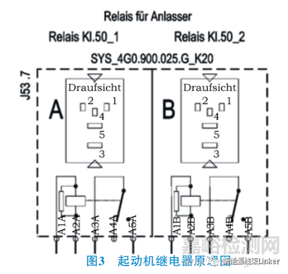2)這些繼電器是發(fā)動機(jī)線束的下級散件,因此繼續(xù)檢查發(fā)動機(jī)線束圖紙,確認(rèn)燒蝕中心為起動機(jī)的繼電器,其原理如圖3所示。