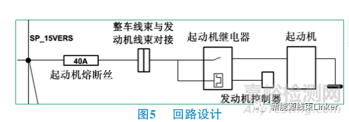 由此得知,此處繼電器燒蝕時(shí)的電流應(yīng)該不超過40 A,否則熔斷絲會熔斷從而斷開回路。根據(jù)燒蝕最嚴(yán)重的位置處于繼電器內(nèi)部,推測可能是繼電器內(nèi)部有持續(xù)或者間斷的小電流流通,導(dǎo)致繼電器引腳反復(fù)吸合從而過熱,進(jìn)而引發(fā)整個繼電器的燒蝕。繼續(xù)檢查此處的回路設(shè)計(jì),原理如圖5所示。