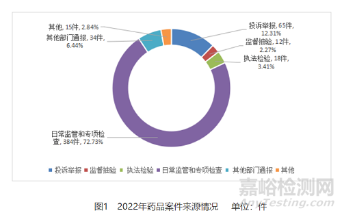 2022年來源于日常監(jiān)管和專項檢查的案件384件,占藥品案件總數(shù)的72.73%;來源于投訴舉報的案件65件,占總數(shù)的12.31%;來源于監(jiān)督抽驗的案件12件,占總數(shù)的2.27%;來源于執(zhí)法檢驗的案件18件,占總數(shù)的3.41%,來源于其他部門通報的案件34件,占總數(shù)的6.44%,來源于其他的案件15件,占總數(shù)的2.84%。