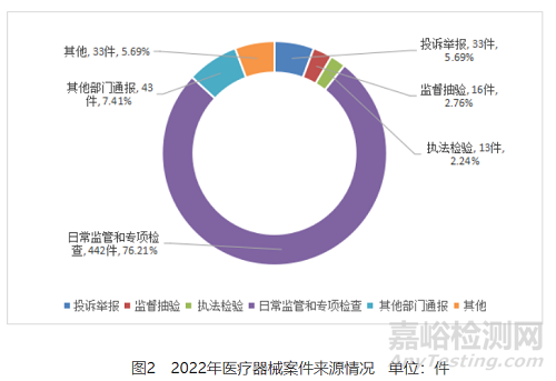 2022年醫(yī)療器械案件的主要來源是日常監(jiān)管和專項檢查442件(占76.21%),投訴舉報33件(占5.69%)、監(jiān)督抽驗16件(占2.76%)、其他部門通報43件(占7.41%)、執(zhí)法檢驗13件(占2.24%)和其他33件(占5.69%)。