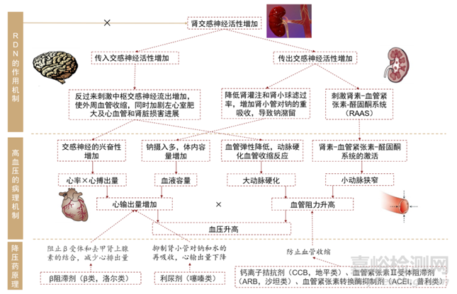 血壓由體內(nèi)多個(gè)系統(tǒng)(包括神經(jīng)系統(tǒng)、循環(huán)系統(tǒng)及內(nèi)分泌(荷爾蒙)系統(tǒng))發(fā)出的信號(hào)進(jìn)行復(fù)雜的交互作用所控制。往返腎臟的神經(jīng)于控制血壓方面尤其重要。腎臟中交感神經(jīng)系統(tǒng)的過(guò)度激活可導(dǎo)致不適當(dāng)激活腎素——血管緊張素——醛固酮系統(tǒng)(RAAS),使血管收縮增強(qiáng)、腎臟處理出現(xiàn)異常及血容量增加,從而可能導(dǎo)致血壓上升。腎素是一種重要的管理血壓的激素。腎動(dòng)脈上富含交感神經(jīng)叢,腎交感神經(jīng)過(guò)度激活導(dǎo)致腎上腺素分泌、鈉重吸收和腎灌注減少。交感神經(jīng)活動(dòng)的增加在原發(fā)性高血壓的病理生理學(xué)中起關(guān)鍵作用。交感神經(jīng)系統(tǒng)過(guò)度激活也可能影響心臟,使心輸出量增加,從而亦可能導(dǎo)致血壓上升。