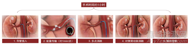 在腎神經(jīng)阻斷手術(shù)中,醫(yī)生首先進(jìn)行腎血管造影以確認(rèn)腎動(dòng)脈的解剖結(jié)構(gòu)(尤其是評(píng)估其解剖學(xué)適應(yīng)性,包括血管直徑、長(zhǎng)度、起源角度及是否存在動(dòng)脈粥樣硬化斑塊)。然后,醫(yī)生將引導(dǎo)導(dǎo)管穿過(guò)患者大腿上部的股動(dòng)脈或手臂中的橈動(dòng)脈插入腎動(dòng)脈開(kāi)口,并將導(dǎo)絲導(dǎo)入腎動(dòng)脈分支的遠(yuǎn)端(直徑>=3毫米)。當(dāng)消融導(dǎo)管沿導(dǎo)絲到達(dá)治療位置時(shí),會(huì)收回導(dǎo)絲,而消融導(dǎo)管的尖端以獨(dú)特的螺旋構(gòu)型展開(kāi)。自動(dòng)定位的電極自動(dòng)適應(yīng)腎動(dòng)脈血管內(nèi)壁,透過(guò)四個(gè)方向的限制分布,以實(shí)現(xiàn)360度動(dòng)脈壁消融。在射頻發(fā)生器的控制下,能量傳遞至電極,并擴(kuò)散至四周的神經(jīng)以進(jìn)行消融,從而幫助控制血壓。一般而言,醫(yī)生將決定腎動(dòng)脈的治療位置及頻率,而直徑3至8毫米的腎動(dòng)脈血管的所有部分神經(jīng)將被消融。一旦一條腎動(dòng)脈的神經(jīng)被消融,則將繼續(xù)消融另一條腎動(dòng)脈神經(jīng)。消融應(yīng)遵循完整性及充分性的標(biāo)淮。對(duì)兩個(gè)緊臟進(jìn)行治療后,會(huì)移除導(dǎo)管,且不留任何永久性植入物。若為每個(gè)腎臟進(jìn)行六次消融術(shù),則每個(gè)腎臟的總治療時(shí)間一般少于20分鐘,且手術(shù)相對(duì)容易進(jìn)行。