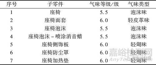 表1為座椅子零件的氣味狀態(tài)。由表可以看出,氣味狀態(tài)不良且味型與座椅一致的為座椅泡沫。