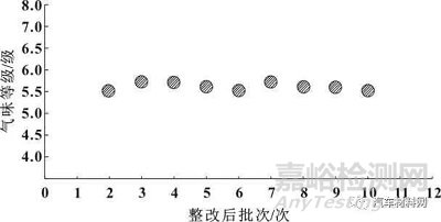 通過以上的氣味提升方案,采用SPC統(tǒng)計(jì)過程質(zhì)量分析工具,收集了多批次C廠家的氣味結(jié)果。由圖可以看出,氣味提升方案有效,且能夠穩(wěn)定地維持在氣味6級以上,達(dá)到了相應(yīng)的氣味要求。