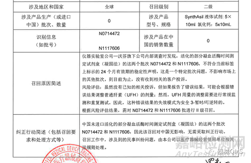 沃芬醫(yī)療器械商貿(mào)(北京)有限公司報告,由于特定批次不符合當前標簽上標示的24小時有效期的穩(wěn)定性聲明,生產(chǎn)商儀器實驗室公司Instrumentation Laboratory Co.對活化的部分凝血活酶時間測定試劑盒(凝固法)HemosIL SynthAsil(國械注進20162404613)主動召回。召回級別為二級召回。涉及產(chǎn)品的型號、規(guī)格及批次等詳細信息見《醫(yī)療器械召回事件報告表》。