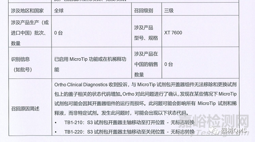 奧森多醫(yī)療器械貿(mào)易(中國)有限公司報告,由于在某些情況下MicroTip試劑包可能會因其開蓋器組件的運行而損壞,生產(chǎn)商奧森多臨床診斷(美國)股份有限公司Ortho-Clinical Diagnostics, Inc.對全自動生化免疫分析儀(國械注進20232220063)主動召回。召回級別為三級召回。涉及產(chǎn)品的型號、規(guī)格及批次等詳細信息見《醫(yī)療器械召回事件報告表》。