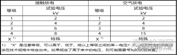 標(biāo)準(zhǔn)規(guī)定:接觸放電是優(yōu)先選擇的試驗(yàn)方法,空氣放電則用于不能使用接觸放電的場合(如表面涂有絕緣層、計(jì)算機(jī)鍵盤縫隙等情況)。對于有金屬外殼或?qū)ν饨涌诘拇蟛糠之a(chǎn)品或設(shè)備,目前這兩種試驗(yàn)方法通常都被用戶要求進(jìn)行。兩種試驗(yàn)方法的電壓等級分別如下表1所示。