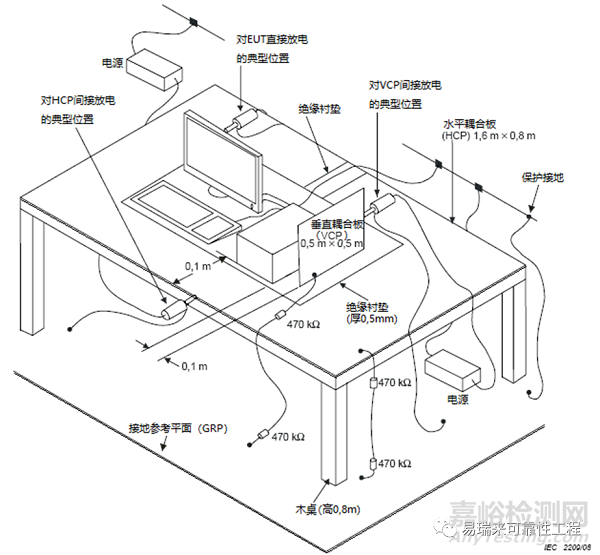 對于臺(tái)式設(shè)備,如圖8 所述,受試設(shè)備放于絕緣村墊(厚0.5mm)上,絕緣襯墊位于水平耦合板上。對受試設(shè)備上可觸及的金屬部分施加靜電放電,其金屬部分和水平耦合板之間應(yīng)使用帶泄放電阻的電纜連接。