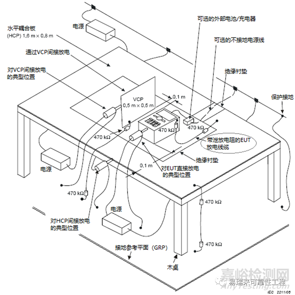 消除施加靜電放電點(diǎn)的電荷應(yīng)使用類似水平耦合板和垂直耦合板用兩端帶有470kΩ泄放電阻的電纜。