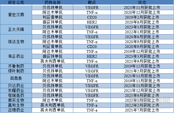 生物制藥特點(diǎn)之一就是藥品價(jià)格相對昂貴,經(jīng)濟(jì)發(fā)展較差地區(qū)那一負(fù)擔(dān)。2005-2019年間已有55種生物類似藥在歐盟(EU)市場獲得批準(zhǔn),其中包括生長激素、促紅細(xì)胞生成劑(ESA)、粒細(xì)胞集落刺激因子(G-CSF)和單克隆抗體。歐洲藥品管理局(EMA)于2010年3月允許批準(zhǔn)符合FDA許可的原研藥的生物類似藥。2015年9月,F(xiàn)DA批準(zhǔn)了美國第一個(gè)生物類似藥,Sandoz公司的filgrastim(Zarxio®)。2016年4月,F(xiàn)DA批準(zhǔn)了第一個(gè)生物類似藥單克隆抗體,Celltrion公司的英夫利昔單抗(Inflectra®)。2019年2月國內(nèi)首個(gè)上市生物類似藥漢利康(利妥昔單抗)(復(fù)宏漢霖)獲批上市。下表為國內(nèi)生物類似藥上市情況及藥物名靶點(diǎn)。