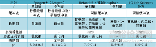 Bioceuticals公司開發(fā)出了不含HSA促紅細(xì)胞生成素處方,該處方含有氨基酸(甘氨酸、亮氨酸、異亮氨酸、蘇氨酸、谷氨酸和苯丙氨酸)、絡(luò)合劑(氯化鈣)、滲透壓調(diào)節(jié)劑(氯化鈉)、磷酸鹽緩沖液和表面活性劑(PS20)。因此Bioceuticals公司也與輝瑞公司Hospira簽訂了獨(dú)家協(xié)議,在美國和加拿大開發(fā)、生產(chǎn)和銷售促紅細(xì)胞生成素,Retacrit®(Amgen公司Epogen® 和Procrit®(epoetin alfa)的生物類似藥)。Retacrit® 是美國市場上第一款獲得批準(zhǔn)的Epogen®生物類似藥。LG Life Sciences 則使用協(xié)同組合穩(wěn)定劑開發(fā)出一種穩(wěn)定的促紅細(xì)胞生成素處方,其處方成分為:磷酸鹽緩沖液、丙二醇、甘氨酸、氯化鈉和PS20。各處方信息如下表。