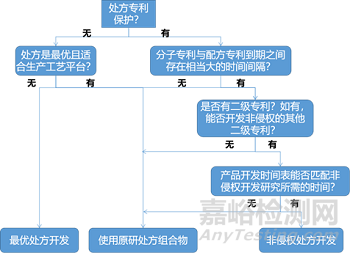 生物藥產(chǎn)品的處方很復(fù)雜,在開發(fā)非侵權(quán)替代處方時(shí)必須考慮多個(gè)變量,這些變量包括分子專利到期與處方專利到期之間的時(shí)間間隔、不侵犯其他二級專利以及合理安排項(xiàng)目時(shí)間表。生物類似藥的開發(fā)難點(diǎn)在于工藝、處方和特殊器件的有效二級專利的復(fù)雜性。原研公司會利用不同的策略來阻礙生物類似藥和后續(xù)生物制劑的申報(bào)上市,這些策略可能包括為有償延遲、專利和解、產(chǎn)品更新和收購競爭對手等。處方專利和產(chǎn)品更新是基于處方延遲生物類似藥競爭的方法。產(chǎn)品更新是原研公司在現(xiàn)有處方基礎(chǔ)上研制新處方,從而提高治療效果或患者依從性,使到期的專利處方轉(zhuǎn)向新處方。因此生物類似藥產(chǎn)品開發(fā)的第一步是審查有關(guān)分子、工藝和藥物產(chǎn)品的知識產(chǎn)權(quán)。非侵權(quán)處方開發(fā)需要來自各方面(知識產(chǎn)權(quán)、處方工藝、產(chǎn)品開發(fā)和項(xiàng)目管理)的意見。決策如圖所示
