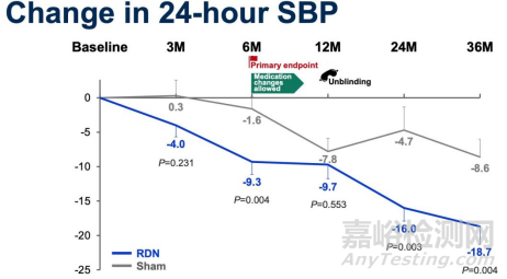 試驗(yàn)結(jié)果:36個(gè)月的隨訪資料顯示,當(dāng)兩組使用了治療強(qiáng)度相似的抗高血壓藥物時(shí),RDN組動(dòng)態(tài)收縮壓降幅顯著高于假手術(shù)組,RDN治療與Sham相對(duì)比,顯著降低患者血壓可達(dá)3年,且無(wú)安全性問(wèn)題,這一療法可作為高血壓患者藥物治療的替代方案。