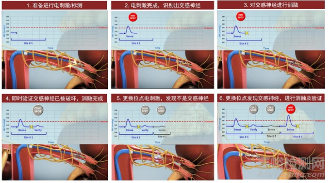 RDN治療高血壓的安全性和有效性已被多項(xiàng)研究反復(fù)證實(shí),但無(wú)論何種能量源治療,目前總體臨床有效率約在60%-65%間,總有近30%的患者對(duì)消融治療無(wú)反應(yīng),是因腎動(dòng)脈周圍分布不同的神經(jīng),包括交感和副交感神經(jīng),當(dāng)前RDN大多以盲目的方式對(duì)整段腎動(dòng)脈消融,無(wú)法確定腎交感神經(jīng)的分布點(diǎn),只能借助介入醫(yī)生的經(jīng)驗(yàn),這可能會(huì)破壞副交感神經(jīng),影響手術(shù)效果,標(biāo)測(cè)腎神經(jīng)可以實(shí)現(xiàn)靶向去除腎交感神經(jīng),保留其他類別的神經(jīng)。