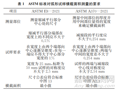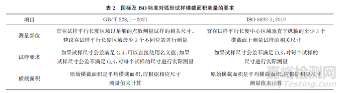 拉伸試驗是材料力學(xué)性能測試中重要的試驗方法之一。室溫拉伸試驗一般是指試樣在室溫環(huán)境,承受軸向拉伸載荷的條件下,測定材料特性的試驗方法。不同的拉伸試驗標(biāo)準(zhǔn)對試樣原始橫截面積測量和計算方法有所不同,ASTM標(biāo)準(zhǔn)(ASTM E8—2021《金 屬 材 料 拉 伸 試 驗 的 標(biāo) 準(zhǔn) 試 驗 方 法》和ASTM A370—2021《鋼產(chǎn)品機(jī)械性能測試的方法和定義》)對弧形試樣橫截面積測量的要求如表1所示,國標(biāo)(GB/T 228.1—2021 《金屬材料 拉伸試驗第1部分:室溫試驗方法》)及ISO標(biāo)準(zhǔn)(ISO 6892-1:2019《金屬材料-拉伸試驗-第1部分:室溫下試驗方法》)對弧形試樣橫截面積測量的要求如表2所示。為了驗證標(biāo)準(zhǔn)要求與實際操作的符合性,蔡煜、殷緒強(qiáng)等研究人員依據(jù)ASTM A 370—2021和GB/T 228.1—2021對鋼管弧形試樣進(jìn)行拉伸試驗,研究了試樣尺寸測量方法對鋼管弧形試樣力學(xué)性能的影響。