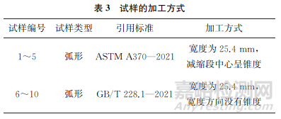 將性能均勻、穩(wěn)定,規(guī)格為177.8mm×8.05mm(外徑×壁厚)的37Mn5鋼管加工成弧形試樣,為了保證試驗結(jié)果的一致性,所有試樣的平行段寬度均按照25.4mm進(jìn)行加工,加工方式如表3所示。