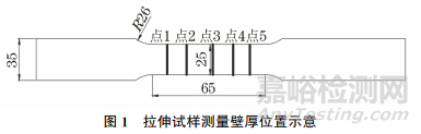 試樣1~10均在減縮段劃分成5個區(qū)域,在每個區(qū)域內(nèi)測量壁厚并進(jìn)行記錄(見圖1),試樣1~5直接測量中心部位(點3),按最小值進(jìn)行計算;試樣6~10在平行段部位測量寬度,按平均值進(jìn)行計算。