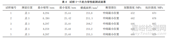 根據(jù)表4,5所示的斷裂部位進(jìn)行分析,當(dāng)寬度基本一致時,若排除試樣本身缺陷和加工缺陷的影響,拉伸斷裂較大概率發(fā)生在試樣平行部分原始橫截面尺寸較小的部位附近。按照 ASTM A370—2021標(biāo)準(zhǔn)加工試樣,加工時規(guī)定可以在減縮段加工一個錐度,控制減縮段中間最小部位的寬度比兩側(cè)寬度小0.04mm,測量時直接測量中間最小部位的寬度,并在該部位測量壁厚,測量3次取最小值,從斷裂部位看,基本都斷裂在測量部位,說明該試樣的力學(xué)性能測試結(jié)果更接近真實值。按照GB/T 228.1—2021標(biāo)準(zhǔn)要求,在試樣平行段測量足夠的點數(shù),并取平均值參與橫截面積計算,對于壁厚差異較小的試樣,可選擇3點平均法進(jìn)行計算,對于壁厚差異較大的試樣,使用5點或5點以上平均法進(jìn)行計算,利于減少測量結(jié)果的誤差,使力學(xué)性能的測試結(jié)果更接近真實值。