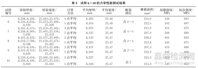 試樣1~5的力學(xué)性能測試結(jié)果如表4所示,試樣6~10的力學(xué)性能測試結(jié)果如表5所示。由表4,5可以看出:按照ASTM A370—2021進(jìn)行拉伸試驗,試樣寬度方向在減縮段中心呈錐度,中間寬度最小,在寬度最小部位測量壁厚,測量結(jié)果差異較小;按照 GB/T 228.1—2021進(jìn)行拉伸試驗,試樣壁厚測量結(jié)果的差異在整個平行段方向最大為0.78mm,選擇3點平均與5點平均的計算方法,強(qiáng)度差異約15MPa。