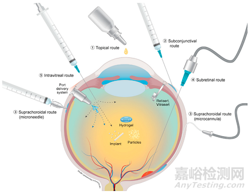 按給藥方式,可分為眼前段和眼后段給藥:眼前段采用外用制劑(滴眼劑、凝膠劑、眼膏劑)進(jìn)行局部給藥;眼后段通過玻璃體腔內(nèi)和眼周注射,或者埋植。