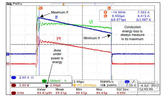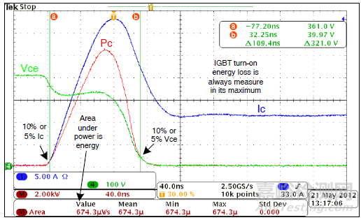 將開(kāi)通波形的電壓和電流相乘,即可計(jì)算出該周期的功率。功率波形的積分顯示在屏幕底部。這就得出了 IGBT 開(kāi)通損耗的能量。