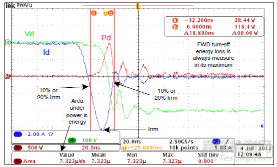 根據(jù)電路拓?fù)浜凸ぷ鳁l件,兩個(gè)芯片之間的功率損耗可能會(huì)有很大差異。IGBT 的損耗可以分解為導(dǎo)通損耗和開(kāi)關(guān)(開(kāi)通和關(guān)斷)損耗,而二極管損耗包括導(dǎo)通和關(guān)斷損耗。準(zhǔn)確測(cè)量這些損耗通常需要使用示波器,通過(guò)電壓和電流探針監(jiān)視器件運(yùn)行期間的波形。測(cè)量能量需要用到數(shù)學(xué)函數(shù)。確定一個(gè)開(kāi)關(guān)周期的總能量后,將其除以開(kāi)關(guān)周期時(shí)間便可得到功耗。