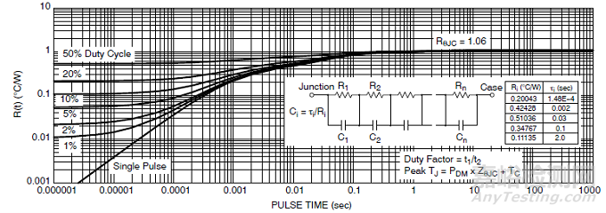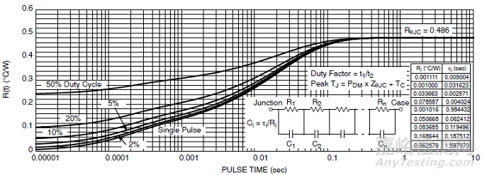 唯一需要的新常數(shù)是 IGBT 或二極管對(duì)于所需脈沖寬度的脈沖值。在 50 Hz 的線(xiàn)頻率下,半周期的時(shí)間為 10 ms。根據(jù)圖 8,對(duì)于 10 ms 脈沖和 50% 占空比,RIGBT 值為 0.375°C/W;根據(jù)圖 9,相同條件下的 RDIODE 值為 0.95°C/W。