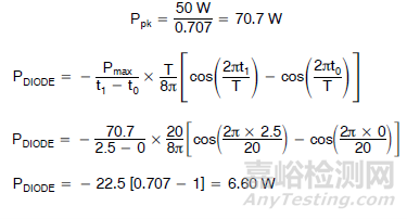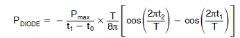 二極管在 t0 到 t1 期間傳導(dǎo)電流。利用電壓過(guò)零點(diǎn)的波形可得出二極管的峰值功耗。知道此功耗值后,我們可以使用 t0 到 t1 期間的平均功耗公式來(lái)求得二極管的平均功耗。