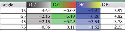 對顏色進(jìn)行比對時,需要從多個角度觀察。對于素色漆,由于無金屬效果顏料的影響,因此通常可以只從正面比對;而對于金屬漆,由于銀粉或者珠光粉的排列問題,不同角度呈現(xiàn)出的效果不一樣,因此正面和側(cè)面都要進(jìn)行檢查,且檢查時樣板與參考板要處于同一平面,板與板之間的距離小于1mm,最終確認(rèn)顏色時勿將色板疊在一起檢查。對于汽車修補(bǔ)漆的顏色,鑒于眼睛直視汽車時,看到的正面顏色的范圍遠(yuǎn)少于眼睛的余光所看到的側(cè)面顏色的范圍,也就是說,對于較難匹配的顏色,配色時盡可能要求側(cè)面顏色的準(zhǔn)確程度比正面要高。