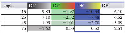常用于測量汽車修補(bǔ)漆顏色的色差儀有三角度(25°、45°、75°)、四角度(15°、25°、45°、75°)、六角度(-15°、15°、25°、45°、75°、110°)。通常情況下,色差儀只能檢測顏料的反射光線,對于顏色中效果顏料顆粒的粒徑大小卻無法測量,如果在色差儀中加一個小型照相機(jī),便可以解決這一問題。色差儀與修補(bǔ)漆配色軟件配合使用,不僅能測量顏色的色差以及顏色之間的差異,還可以根據(jù)反射曲線從數(shù)據(jù)庫中查詢色差接近的顏色,除此之外,軟件可協(xié)助調(diào)色員對顏色進(jìn)行微調(diào),建議增加或減少哪些色母,也會根據(jù)反射曲線給出增加及減少的具體質(zhì)量。