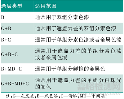 隨著汽車工業(yè)的不斷發(fā)展,汽車漆的顏色種類及色彩特性越來越豐富。清漆效果也多種多樣,主要可分為高光、亞光及質(zhì)感清漆等;顏色通??煞譃樗厣徒饘偕?大類。根據(jù)不同類型的顏色以及它們遮蓋力和鮮艷程度的不同,噴涂工藝有所不同,具體情況如表3所示。