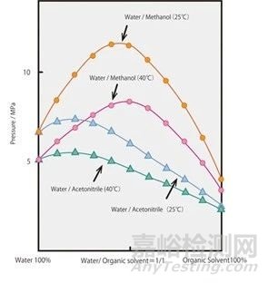 我們的HPLC系統(tǒng)一般能承受的背壓約為4000psi,超過這個(gè)數(shù)值泵就無法工作。因此,應(yīng)優(yōu)先選擇產(chǎn)生最小背壓的流動(dòng)相。有機(jī)溶劑和背壓之間存在怎樣的關(guān)系呢?