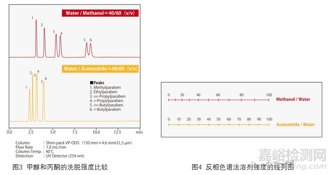 現(xiàn)在我們來了解一下這兩種重要有機(jī)溶劑的強(qiáng)度。圖3展示了使用ODS柱分離對羥基苯甲酸類化合物(即對羥基苯甲酸酯)的一個(gè)例子??梢钥闯霎?dāng)乙腈和甲醇以相同的比例與水混合時(shí),乙腈流動(dòng)相的洗脫強(qiáng)度更大。