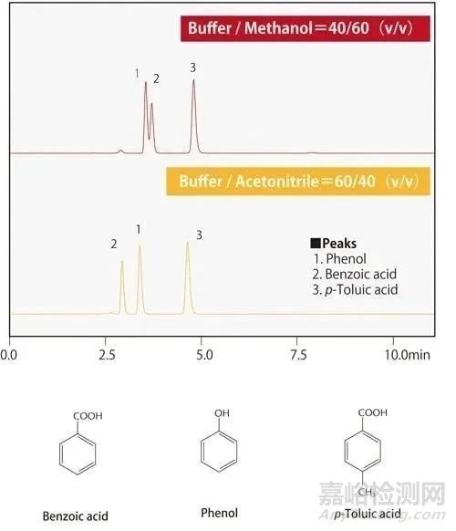 甲醇的流動(dòng)相是緩沖液:甲醇(40:60),而乙腈的流動(dòng)相是緩沖液:乙腈(60:40)。使用的色譜柱是Shim-pack VP-ODS,在這種情況下,我們會發(fā)現(xiàn)用甲醇時(shí),苯酚首先洗脫,然后是苯甲酸,最后是對甲苯酸,但是在乙腈的條件下,會發(fā)現(xiàn)苯甲酸首先洗脫,然后是苯酚,最后是對甲苯酸。那么為什么用乙腈更容易洗脫苯甲酸呢?是什么使苯甲酸先于苯酚洗脫?