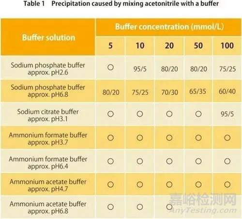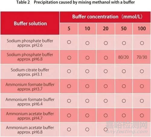 在反相液相色譜中,緩沖液與有機(jī)溶劑的流動(dòng)相混合使用,此時(shí)有機(jī)溶劑的濃度過高可能會導(dǎo)致緩沖鹽沉淀。上表中,分別展示了常用緩沖液與乙腈或甲醇混合后是否會沉淀的情況。我們可以看到,對于某些緩沖液,無論使用哪種有機(jī)溶劑都不會發(fā)生沉淀,但通常情況下,在甲醇條件下產(chǎn)生沉淀的情況較少。