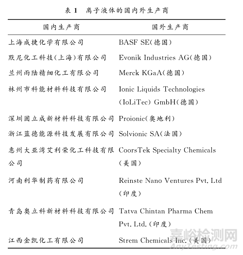下表1為部分離子液體國內(nèi)外的生產(chǎn)商。由于離子液體具有不燃性,也被直接用于改善聚合物的阻燃性能。