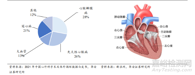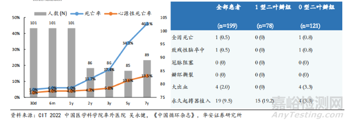 心血管病分類中瓣膜性疾病手術(shù)占比最高,治療缺口巨大。根據(jù) 2021 年《中國心外科手術(shù)及體外循環(huán)數(shù)據(jù)白皮書》數(shù)據(jù),心臟瓣膜病是心血管病種分類手術(shù)量占比最高的疾病。心臟瓣膜病指四個心臟瓣膜(主動脈瓣、肺動脈瓣、二尖瓣及三尖瓣)中一個或多個出現(xiàn)損傷或缺陷。其中發(fā)生在主動脈的心臟瓣膜病包括主動脈狹窄和主動脈反流。若得不到及時治療,重度主動脈瓣狹窄(AS)患者 2 年生存率約50%,5 年生存率僅為 20%;重度主動脈瓣反流(AR)患者 5 年生存率僅為30%。