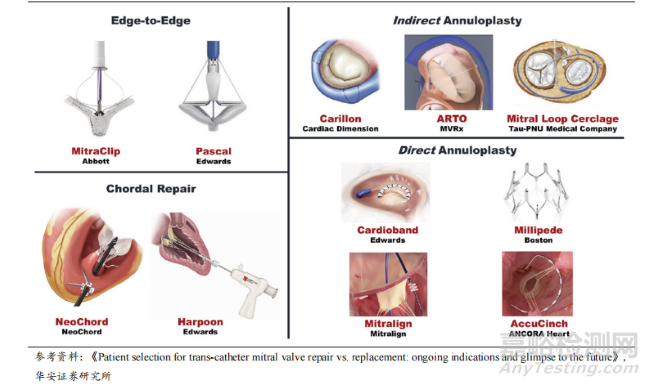 (2)經(jīng)導(dǎo)管二尖瓣置換術(shù)(TMVR):類似TAVR,經(jīng)外周血管或者經(jīng)心尖途徑,將人工瓣膜錨定在二尖瓣的病變位置,國際現(xiàn)階段產(chǎn)品效果不理想,研發(fā)難度很大。