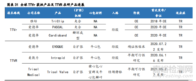 (3)經(jīng)導(dǎo)管三尖瓣置換/修復(fù)術(shù)(TTVR/r):原理類似TMVR,經(jīng)導(dǎo)管三尖瓣介入治療主要分為置換和修復(fù)兩大類,多數(shù)為在研產(chǎn)品,全球布局較晚,研發(fā)難度較大。