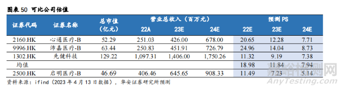 我們選取了國內(nèi)主營業(yè)務(wù)涉及結(jié)構(gòu)性心臟病/心血管疾病業(yè)務(wù)的可比公司:沛嘉醫(yī)療、心通醫(yī)療、先健科技??紤]到公司尚未盈利,我們采取港股可比公司市銷率(PS)均值作為啟明醫(yī)療的估值參照:截至2023年4月13日,H股可比公司2022-2024年平均PS為19/12/8倍,我們預(yù)測公司2022-2024年P(guān)S為11.49/7.23/5.14倍。