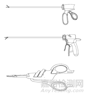 圖1 超聲刀頭各類手柄示意圖,夾鉗式(上)、握式(中)、剪式(下)