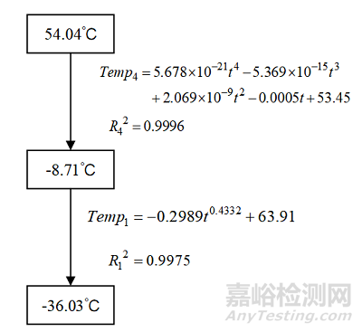 根據(jù)上述分析可得極端溫度下發(fā)動機(jī)滑油溫度上升段曲線特征如圖4所示:在-40℃極端環(huán)境下發(fā)動機(jī)滑油最低溫度為-36.03℃,隨著發(fā)動機(jī)試車起動,滑油溫度逐漸升高,升至54.04℃前,滑油溫度上升規(guī)律更符合四次多項(xiàng)式形式擬合曲線;升至54.04℃后,滑油溫度上升規(guī)律更符合冪函數(shù)形式擬合曲線。