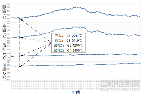 根據(jù)外場百葉箱裝置測量結(jié)果,飛機(jī)外場環(huán)境試驗(yàn)中環(huán)境溫度最低點(diǎn)為夜晚的-35℃,實(shí)際飛機(jī)外場試驗(yàn)是在早晨的溫度回升階段進(jìn)行的,故其機(jī)采設(shè)備測溫高于外部環(huán)境溫度,選取外場環(huán)境下飛機(jī)靜溫/總溫為-28.8℃。在此環(huán)境下,作為飛機(jī)的重要核心系統(tǒng),發(fā)動機(jī)需滿足適航條款要求,即發(fā)動機(jī)能在特定低溫環(huán)境溫度下正常起動,因此發(fā)動機(jī)起動的耐受溫度邊界是整機(jī)環(huán)境試驗(yàn)的重要參數(shù)。而發(fā)動機(jī)外部溫度傳感器安裝在吊掛上,并且吊掛環(huán)境溫度直接關(guān)聯(lián)著發(fā)動機(jī)燃油和液壓油的油液溫度,所以本小節(jié)圍繞發(fā)動機(jī)附近的吊掛外場環(huán)境溫度作為實(shí)驗(yàn)室環(huán)境有效性的判據(jù),其中外場環(huán)境試驗(yàn)過程中,在飛機(jī)靜溫/總溫為-28.8℃時(shí)吊掛外場環(huán)境溫度均值為-31.9℃。