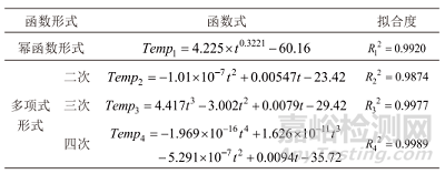 發(fā)動機(jī)試車起動時(shí),滑油溫度隨之上升,根據(jù)滑油溫度試驗(yàn)數(shù)據(jù)上升特點(diǎn),采用冪函數(shù)形式和多項(xiàng)式形式進(jìn)行數(shù)據(jù)擬合,如表1所示。