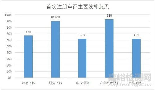 91件首次注冊(cè)發(fā)補(bǔ)涉及68家企業(yè),發(fā)補(bǔ)意見(jiàn)主要集中在綜述資料、研究資料、臨床評(píng)價(jià)、產(chǎn)品技術(shù)要求和產(chǎn)品說(shuō)明書五部分(見(jiàn)圖一),其中綜述資料發(fā)補(bǔ)率67%,研究資料發(fā)補(bǔ)率90.2%,臨床評(píng)價(jià)發(fā)補(bǔ)率62%,產(chǎn)品技術(shù)要求發(fā)補(bǔ)率93%,產(chǎn)品說(shuō)明書發(fā)補(bǔ)率62%。