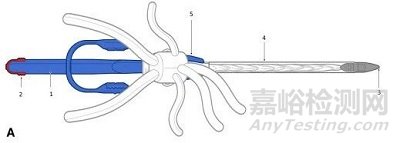 Thoracoflo帶有一個輸送系統(tǒng),輸送系統(tǒng)手柄 (1) 帶有釋放夾 (2),用于引導(dǎo)器尖端 (3) 上近端覆膜支架組件的固定線材,配備用于引入導(dǎo)絲的側(cè)孔,通過10毫米通路分支向外伸出。覆膜支架裝入可拆分的 30-F 剝離護套 (4) 中,并用分離器 (5) 固定。