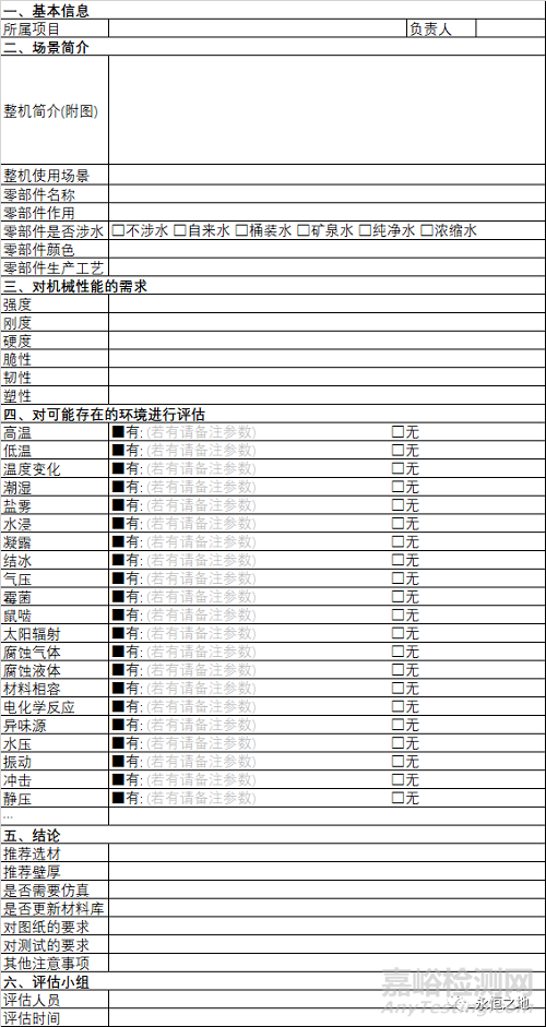 我建議的是結(jié)合自身工作實際情況(產(chǎn)品品類、歷史經(jīng)驗、現(xiàn)有質(zhì)量管控體系等),形成一個材料選材確認表,對使用條件進行簡述,以方便材料工程師根據(jù)條件作出基本選材推薦。
