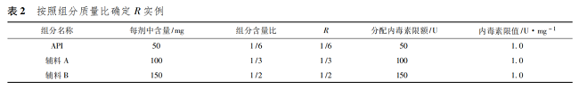 如果不考慮藥用輔料和生產(chǎn)工藝等因素,原料藥的標(biāo)準(zhǔn)也會定為 6. 0 EU·mg - 1,這樣,所有藥用輔料等將無法制定內(nèi)毒素標(biāo)準(zhǔn)。引入 R 的概念,就是將產(chǎn)品中內(nèi)毒素限額合理的分配到制劑的各組分中。假設(shè)原料藥和藥用輔料是同等重要的,在不考慮工藝、包材污染等情況下,就是按質(zhì)量占比分配內(nèi)毒素限額( 表 2) 。
