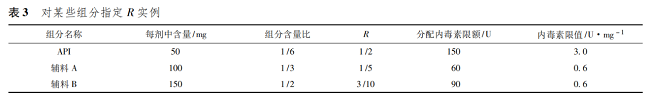 對于一些用量較小或者很難單獨(dú)進(jìn)行細(xì)菌內(nèi)毒素檢測的藥用輔料,可以考慮將不同輔料按照配方的比例混合后進(jìn)行檢測。如表 3 中情況,可以將輔料 A 和輔料 B 按 2∶ 3 的比例混合后,對混合物進(jìn)行檢測,限度為 0. 6 U·mg - 1。