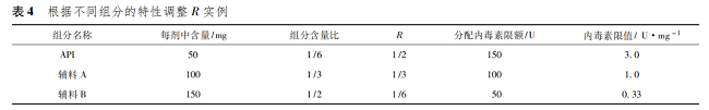 由表 2 可以看出,計(jì)算出來的限度,API 與不同的藥用輔料均相同,各種組分內(nèi)毒素污染的最大限度和可以保證產(chǎn)品符合規(guī)定。實(shí)際工作中確定 R 值,不同組分的質(zhì)量比僅是參考,API 或者不同的藥用輔料對于內(nèi)毒素污染的貢獻(xiàn)可以是不同的。一般認(rèn)為 API 是產(chǎn)品中最重要的組分,因此,R 的分配可以多于質(zhì)量比。各種藥用輔料也可以根據(jù)用量、內(nèi)毒素控制的難易程度等合理分配 R 值。如上例中,如果指定 API 的 R 為 1 /2,則 API 內(nèi)毒素限值可以是 3. 0 U·mg - 1。那么輔料A 和輔料 B 的 R 值和為 1 /2,按質(zhì)量比計(jì)算分別為1 /5 和3 /10,計(jì)算二者內(nèi)毒素限值均為0. 6 U·mg - 1( 表 3) 。如實(shí)際工作中,輔料 A 內(nèi)毒素?zé)o法控制到0. 6 U·mg - 1,只能控制到 1. 0 U·mg - 1,那么可以調(diào)整輔料 B 的限值為 0. 33 U·mg - 1。此時,相當(dāng)于指定 API、輔料 A、輔料 B 的 R 值分別為 1 /2、1 /3、1 /6( 表 4) 。